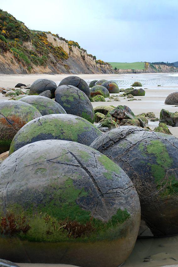 التكوينات الصخرية المحيطة بها . شاطئ الكرات في مورياكي، نيوزلندا :